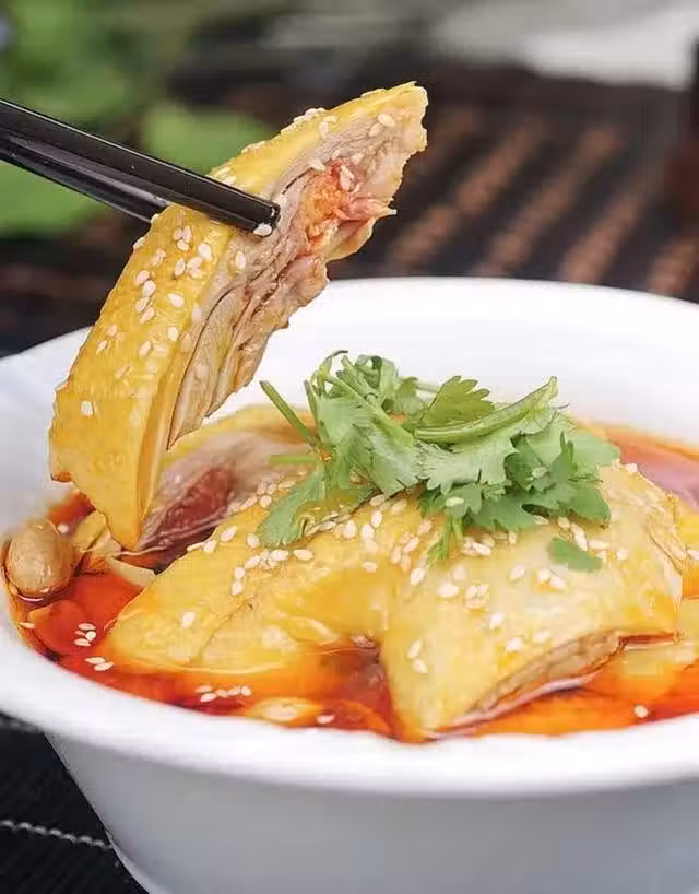 3、碗中放入姜、蒜、蔥蓉拌均勻,鍋內燒油至冒煙,淋入碗中。再加入1/2小勺鹽、1小勺生抽 、1小勺白砂糖 、1小勺芝麻油 、2小勺花椒油 、4大勺油潑辣子 、1大勺芝麻醬、1小勺陳醋、適量熟芝麻、8大勺原雞湯汁,攪拌均勻,放涼備用。
