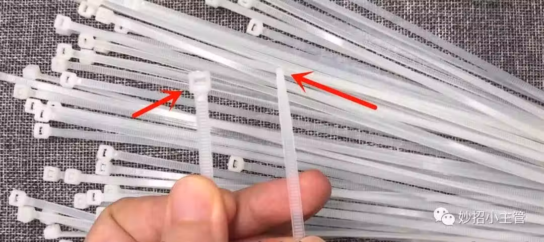 咱們先觀察一下,扎帶一頭的尖的,一頭是穿口,有一面有鋸齒一樣紋路扎的時候,先要分清正反,將有鋸齒紋路的一面朝里彎曲;
