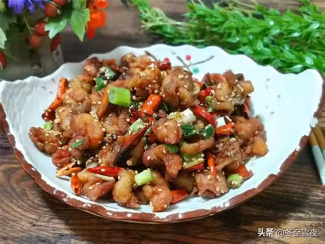 【辣子雞丁】所需材料:雞腿2個、油鹽適量、蔥2棵,姜1塊、大蒜2瓣、干辣椒1把、花椒1湯匙、白糖半湯匙、白鬍椒粉1茶匙、料酒1湯匙、澱粉1湯匙、熟芝麻1湯匙、