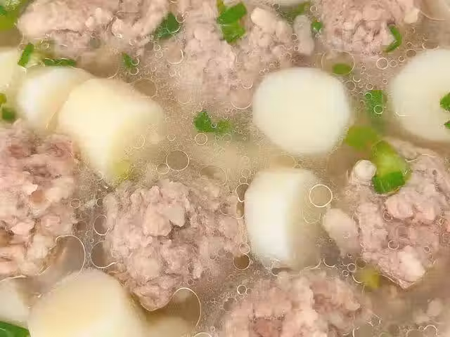 4、山藥煮軟後,放入肉丸子,煮五分鐘煮熟,最後加入食鹽調味,撒上蔥花攪拌均勻即可出鍋開吃。