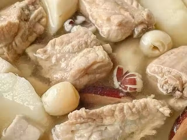 準備食材:排骨,山藥,茯苓,芡實,蓮子,紅棗,薑片,蔥結。
