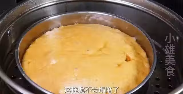 盤子裡倒上一些食用油,用刷子塗滿,蒸好以後方便脫模。把麵糊從高處倒到平底盤中,在震一震,震出裡面的小氣泡。這樣震出來的發糕不管是表面還是裡面,氣孔組織都比較均勻。蒸鍋裡面水燒開,把麵糊放進去,蓋上蓋子。保持大火蒸上40分鐘,蒸馬拉糕火力要足,時間要夠,蒸好以後關火燜五分鐘再開蓋,這樣就不會塌陷了。