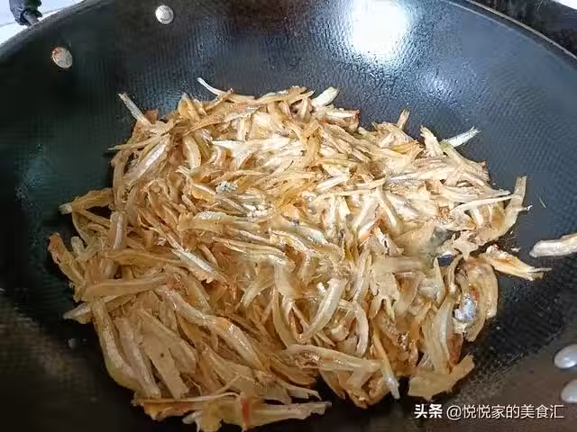 【第二步】:炒鍋洗凈燒燙,放少許食用油,然後把控干水分的小魚仔倒入鍋裡面,先把水分炒干,然後再轉成中小火慢慢的煸炒,把所有的魚乾煸制金黃酥脆即可。倒入蔥姜蒜末炒出香味,