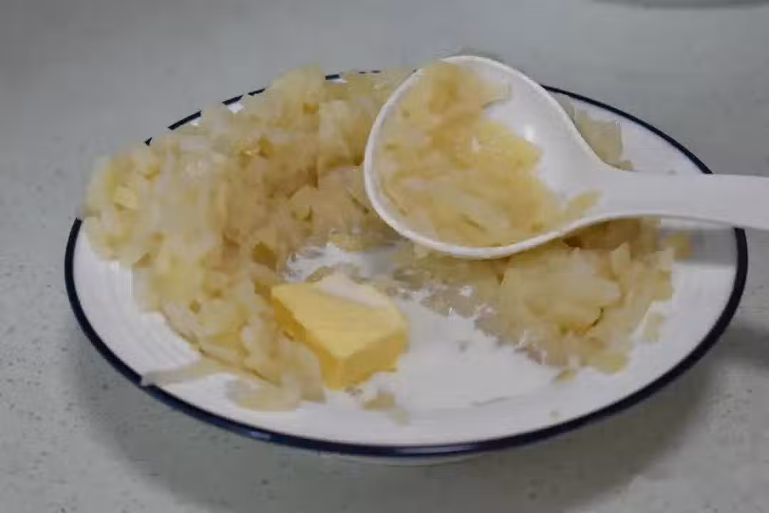 第四步 蒸熟土豆後,趁熱加入50克牛奶和10克黃油,用勺子把土豆壓成土豆泥,並且把牛奶和黃油混合均勻。