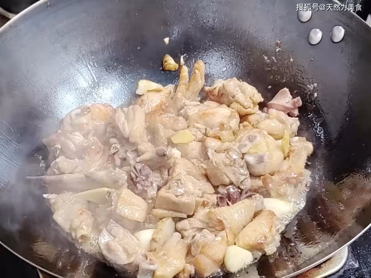6、把調好的料汁攪拌幾下,然後倒入鍋內,翻炒均勻,讓所有的雞肉都能吸收到料汁的味道,翻均勻後改小火加蓋燜3分鐘。