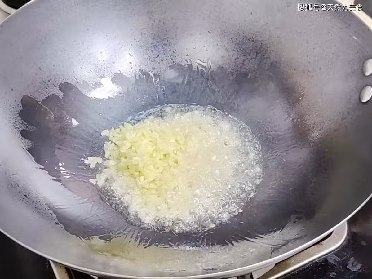 2、薑末和蒜末出香味的時間不同,所以我們先把薑末煸炒15秒後再把蒜末倒入鍋內,和薑末一起煸出香味,這個過程有10秒左右香味就能出來。