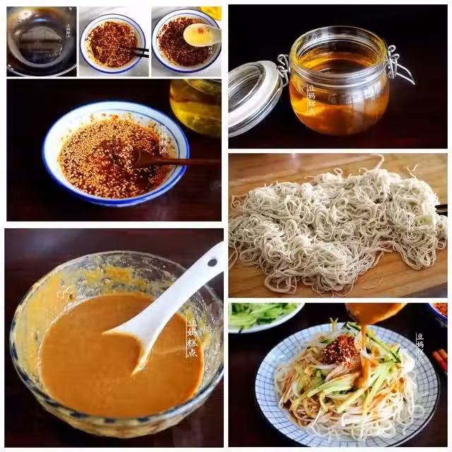 ②、辣椒麵也是提前做的,同樣一次可以多做一些:小碗里放入辣椒麵和白芝麻,將香油燒熱後,分三次淋上去拌勻,然後趁熱向碗里加入2-3勺蔥油,攪拌均勻即成。