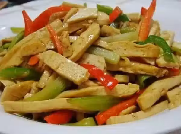 原料:白豆腐乾、紅尖椒、西芹、胡蘿蔔