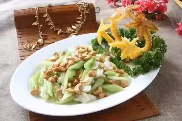 1、西芹洗凈削皮切成菱形塊;百合掰開洗凈;腰果用油炸熟備用;