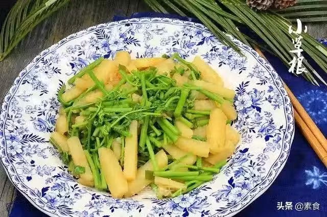 7、土豆八分熟的時候,加蕨菜,加適量的鹽和蔬果粉翻炒調味即可