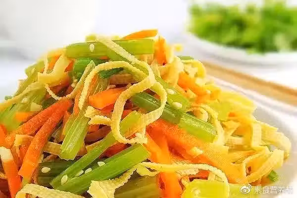 材料:芹菜,豆腐皮,胡蘿蔔,熟白芝麻,鹽,米醋,香油,生抽