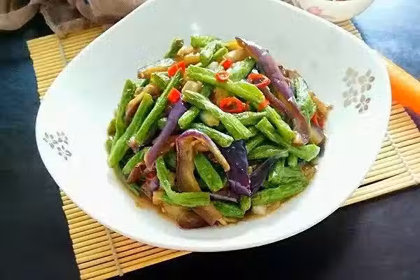 2、茄子及長豆角過大油至八成熟,瀝出備用