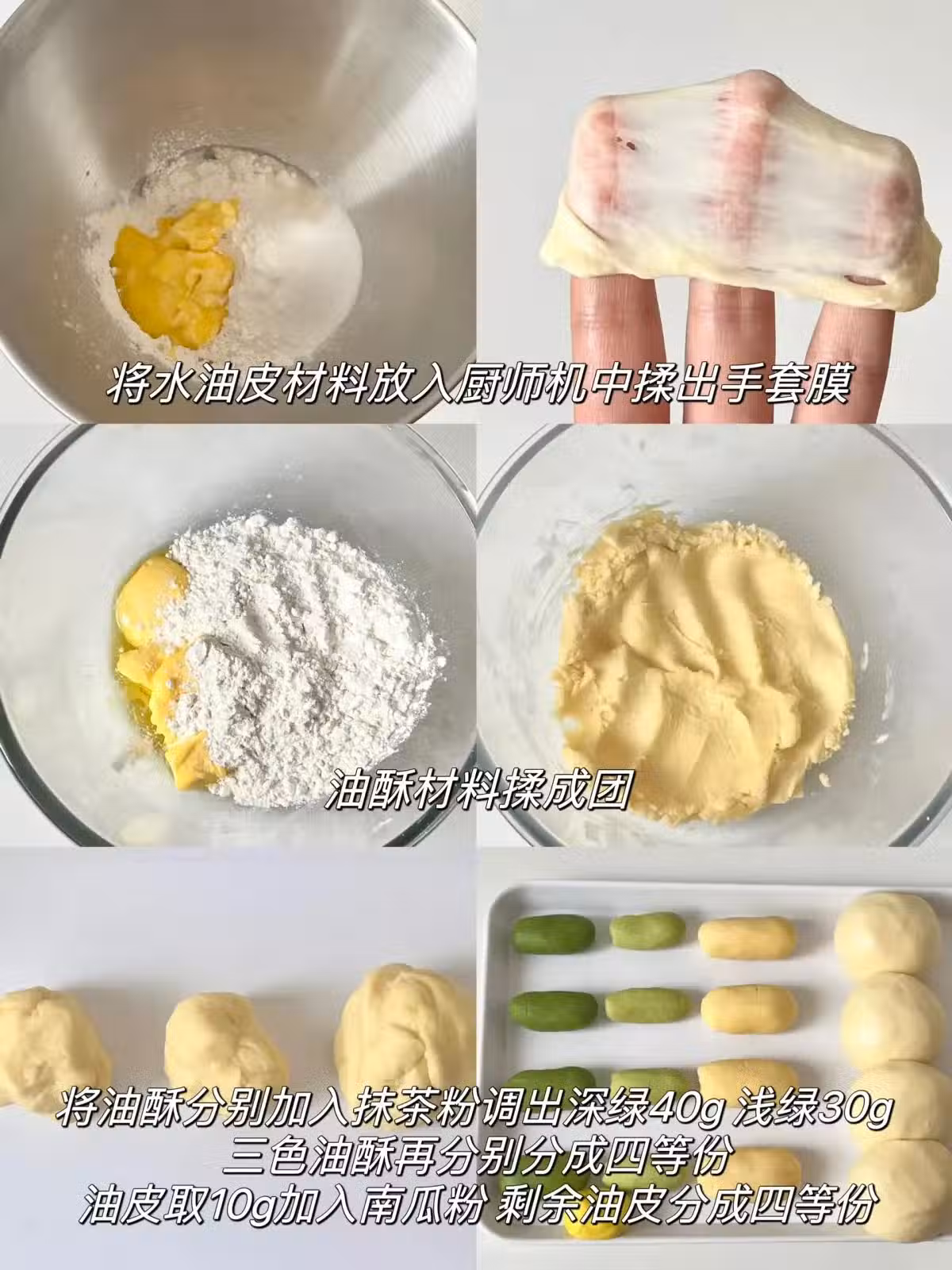 4️⃣將水油皮擀成長方形,三色油酥壓在一起包起來,收口朝下,擀成長方形,從下往上捲起來