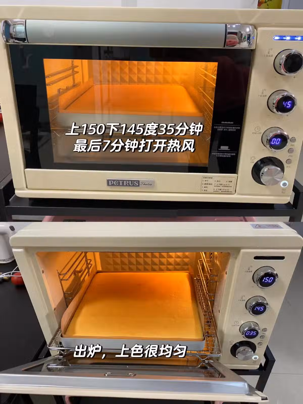 (蛋糕卷位於烤箱中層偏下一些的位置。 不能上下火的烤箱: 155度30分鐘,一開始放最上層,10分鐘後轉到中下層。 中間可以開烤箱門。 最後幾分鐘檢查表皮上色情況,適當調節上火溫度。)