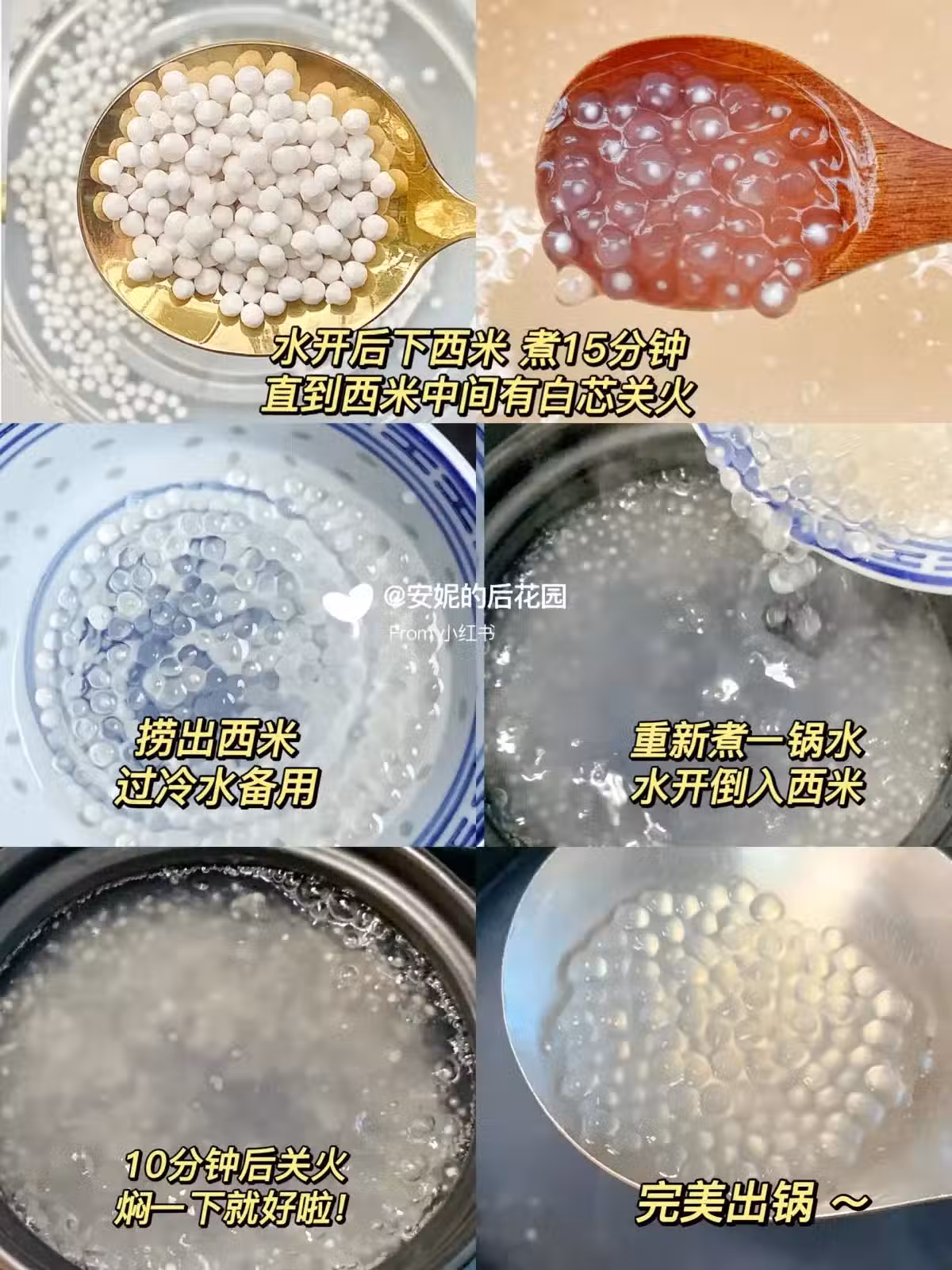 3。取一半芒果搗成泥狀,碗里再放入西柚粒+西米+芒果塊,倒入椰汁攪拌均勻即可!