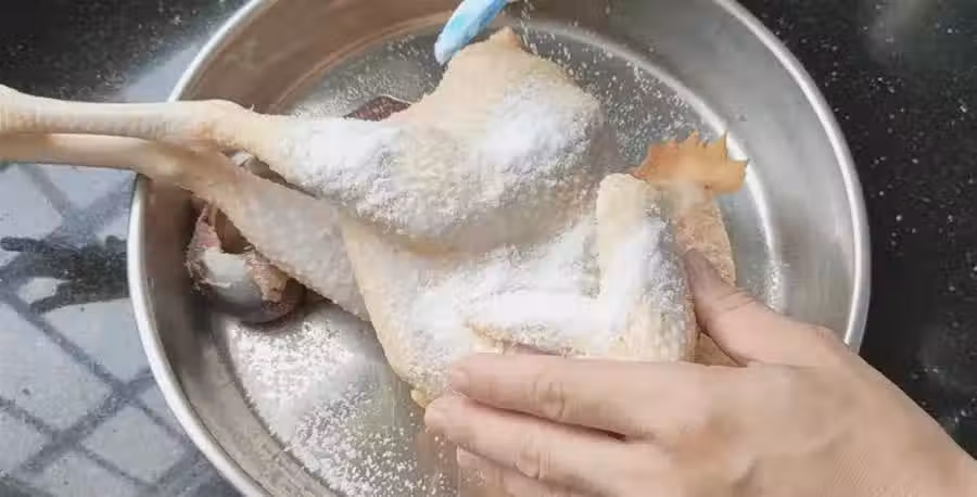 第二步:瀝干水分的雞加入兩勺食用鹽粉,用手慢慢給它按摩入味,雞肚子裡面也要多抹一點鹽,這樣更好入味,做出來的雞咸香味美超好吃,大概給它按摩十分鐘。