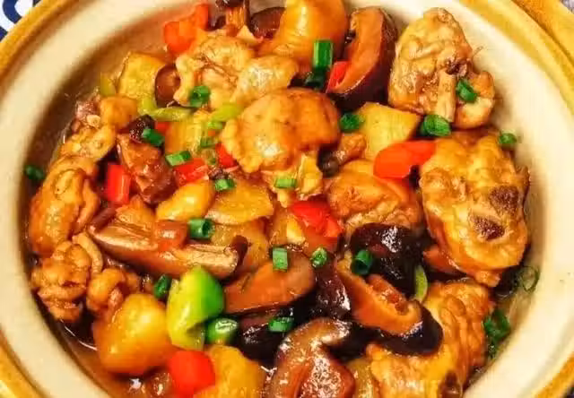 雞腿,青椒,土豆,香菇,料酒,白酒,生抽,鹽,水澱粉,味極鮮,老抽,蚝油,白糖,甜麵醬