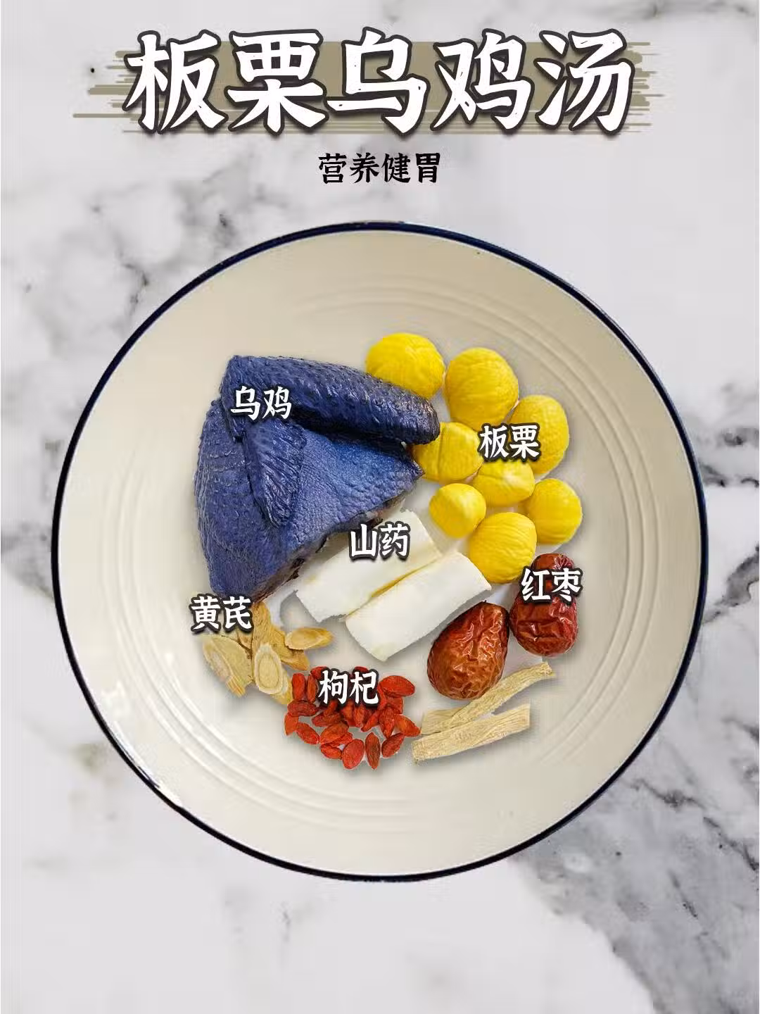 食材:板栗 烏雞 山藥 黃芪 枸杞 紅棗