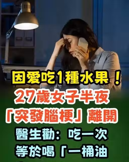 因愛吃1種水果 !27歲女子半夜「突發腦梗」離開了 醫生勸:吃一次等於喝「 一桶油!」