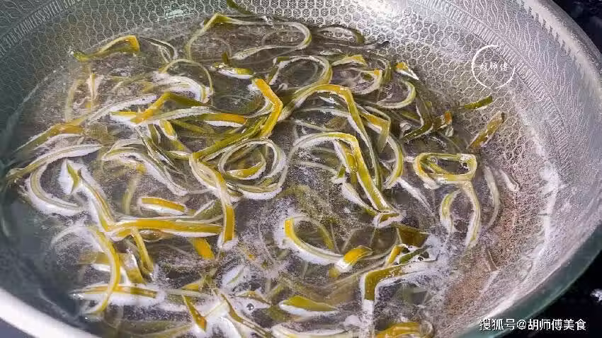 第二步:將海帶切成筷子細的條狀,然後鍋中放入適量的水,大火將水煮開後,接著將海帶放入到鍋中,焯水2分鐘就可以撈出。