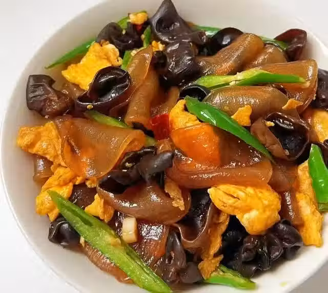 食材:紅薯粉皮、雞蛋、木耳、蒜末、紅辣椒、青辣椒、生抽、老抽、蚝油、鹽、食用油