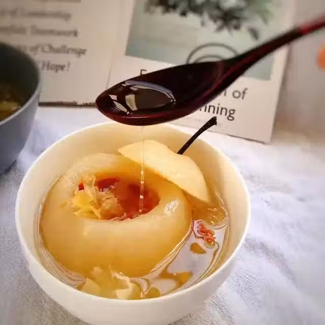 3、中大火蒸30分鐘。梨肉成透明狀就是燉好了。梨肉也可以食用。