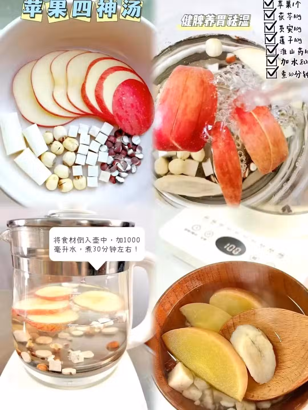 1個蘋果+10g茯苓+10g芡實+10g蓮子+10g淮山藥,加入800ml水,養生壺煮30分鐘就可以哈。