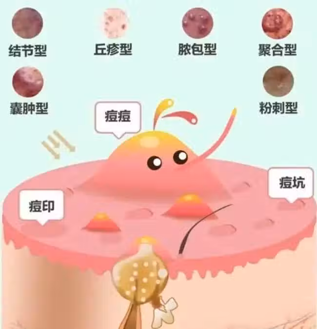 主要表現:痤瘡日久,質地堅硬難消,觸壓有疼痛感,或者顏面凹凸如橘子皮,女性可有月經量少、痛經以及經期痤瘡加重等症狀,舌暗苔薄,脈澀。此型多見於長期慢性患者。