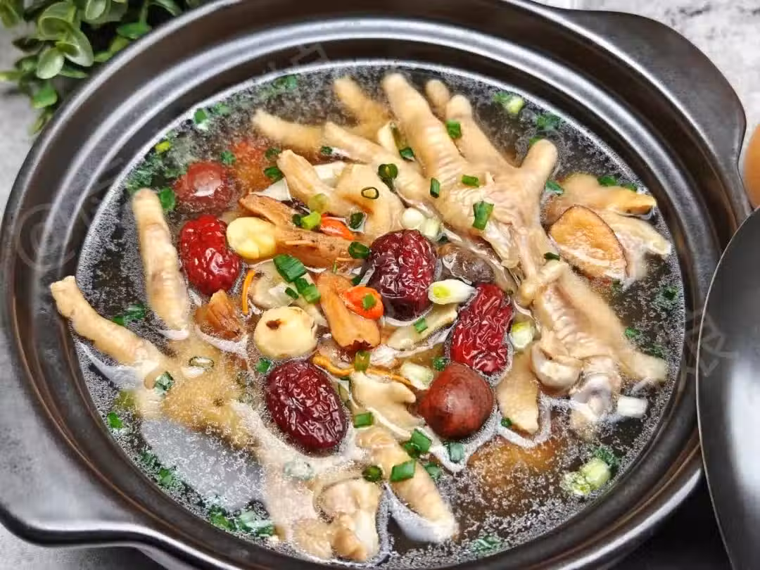 中醫認為,雞腳富含膠原蛋白,有補氣養血、增加皮膚彈性、滋潤明目的作用;搭配黨參、黃芪、桂圓、當歸等藥膳材料,不僅可以改善氣色,還能緩解疲勞,讓皮膚更顯紅潤光澤。