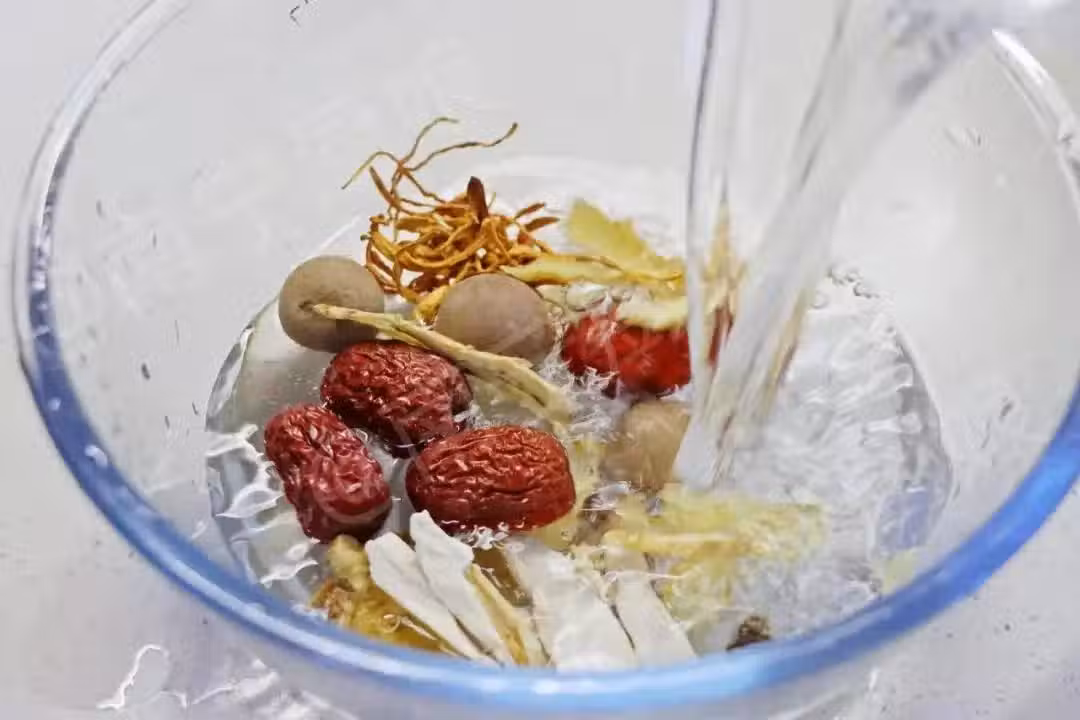 黨參、黃芪、桂圓、紅棗、當歸、玉竹分別用清水沖洗一次,去掉表面的灰塵和雜質,控水備用。