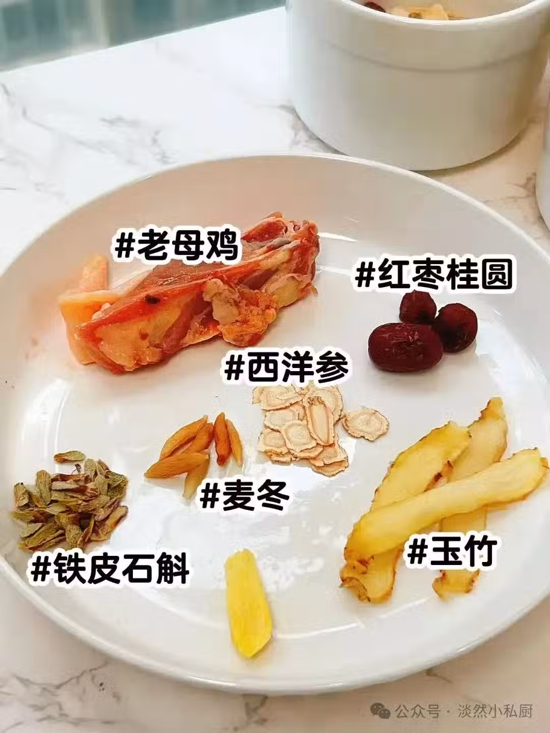 食材:鐵皮石斛2克、玉竹3克、西洋參2克、麥冬3克、老母雞100克、桂圓2顆、紅棗一顆 做法:見下圖 歷代醫家都認為鐵皮石斛具有滋養肝陰的作用,是治療各種肝膽病的藥物,可以用於治療肝炎、膽囊炎、膽結石等肝膽疾病,鐵皮石斛含有豐富的多糖類物質,能夠提高人體的應激能力,具有良好的抗疲勞、耐缺氧的作用。 西洋參有增強中樞神經系統功能。西洋參中的皂甙可以有效增強中樞神經,達到靜心凝神、消除疲勞、增強記憶力等作用,可適用於失眠、煩躁、記憶力衰退及老年痴呆等症狀。
