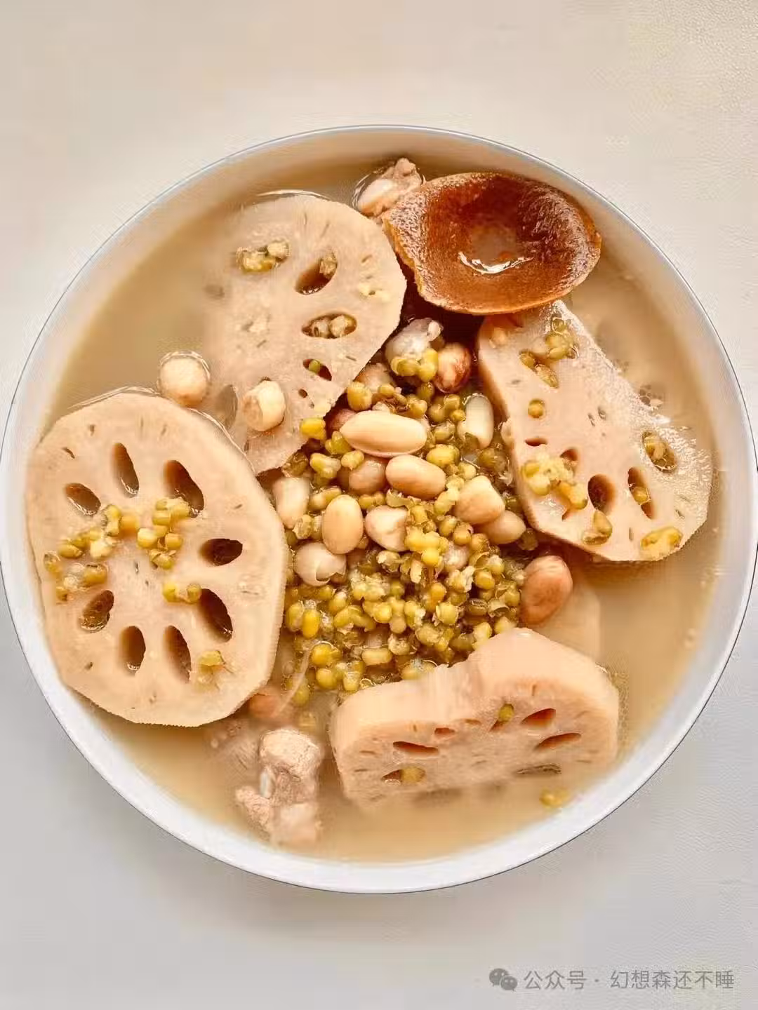 排骨(或豬骨)、蓮藕、綠豆、花生、陳皮 1 片
