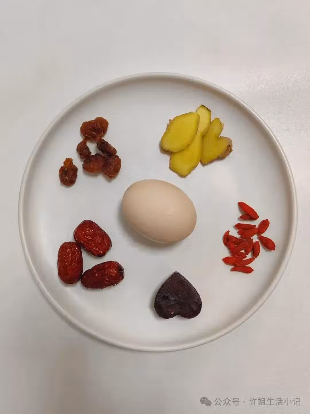 1, 雞蛋加水煮熟,剝殼後用牙籤扎幾下,紅棗去核、姜切片;
