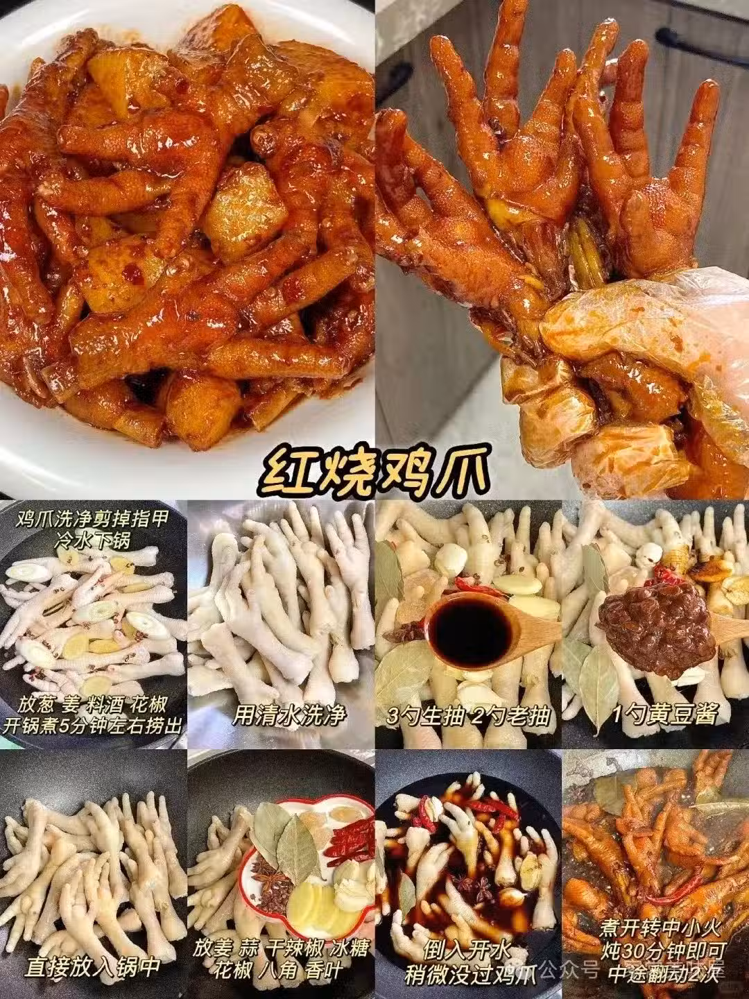 食材:雞爪10隻、生抽1勺、老抽1勺、糖1勺、蔥姜適量。