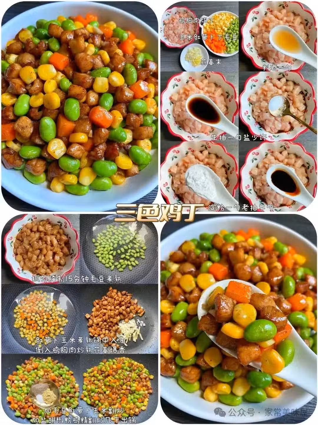 這些雞丁菜肴不僅美味,而且顏色豐富,口感多樣,適合家庭聚餐或日常快餐,提供了多種選擇來滿足不同的口味需求。