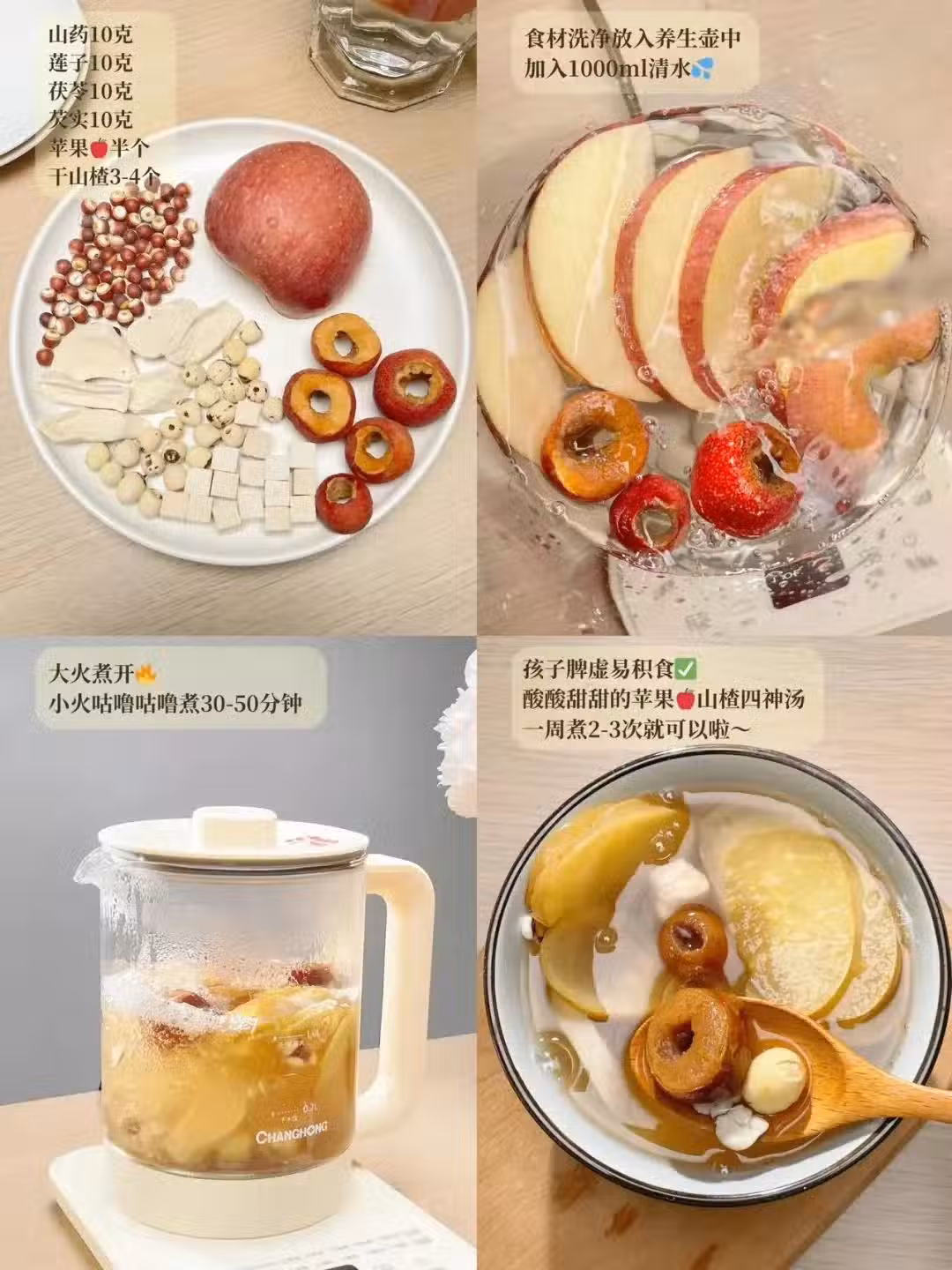 山藥、茯苓、芡實、蓮子,每種食材來上10克,蘋果半個,干山楂3-4個