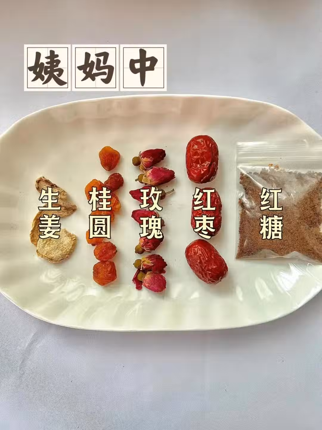食材:桂圓+生薑十紅棗+玫瑰十黑糖