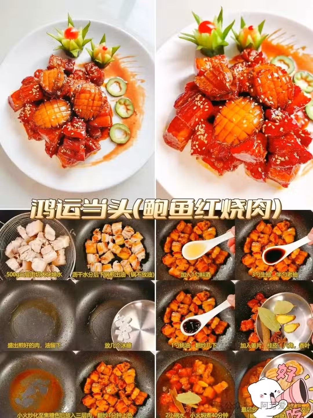 鮑魚紅燒肉,異於鴻運當頭。鮑魚記得開背哦,這樣會更加容易的入味,五花肉一定要先把肉香炒出來,再加入冰糖噢。非常的有味道,又好吃。
