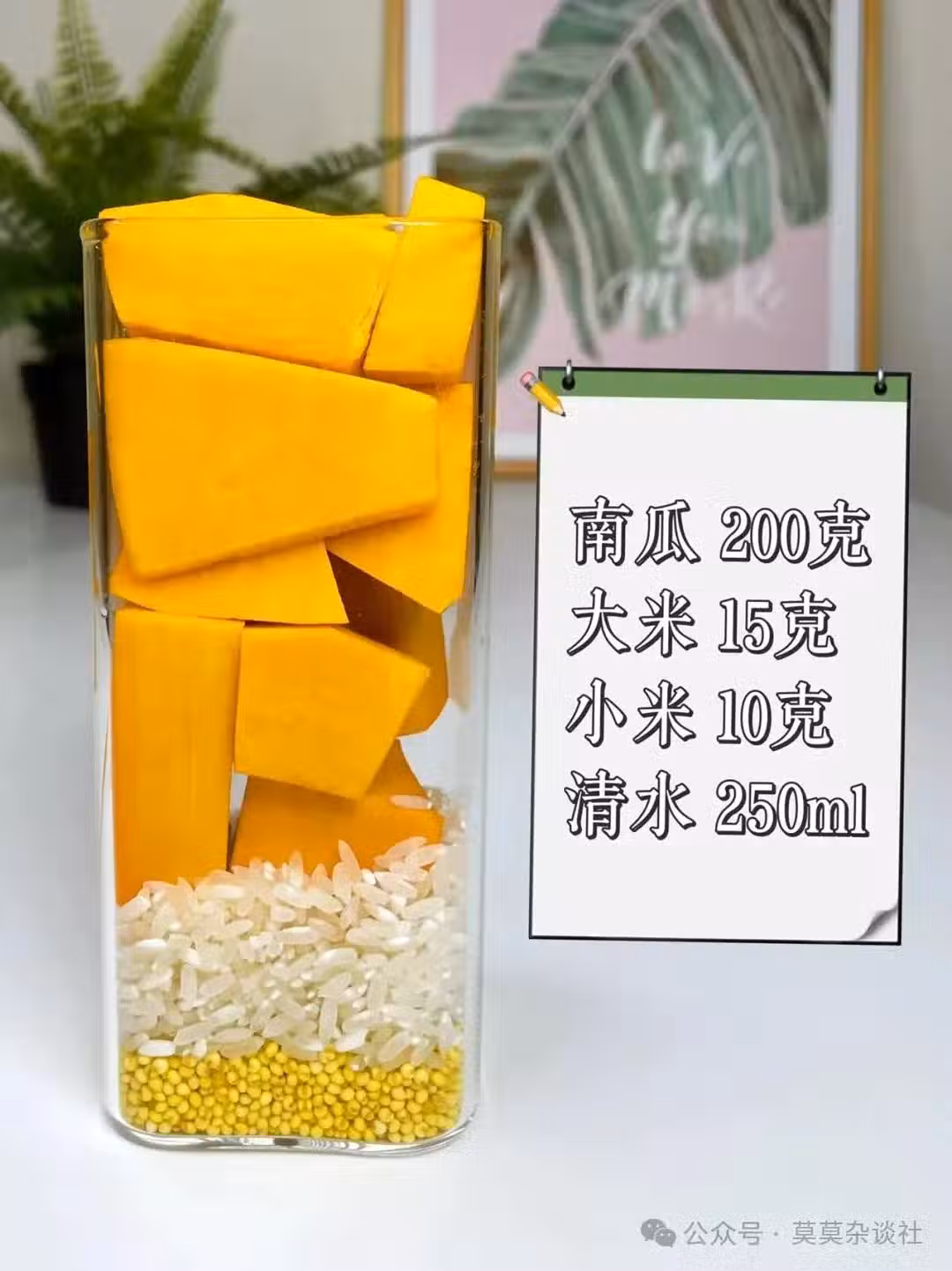 食材:去皮南瓜200g | 大米15g | 小米10g | 清水250~300ml | 冰糖20g | 破壁機米糊模式啟動,最後加入牛奶100~200ml攪拌均勻