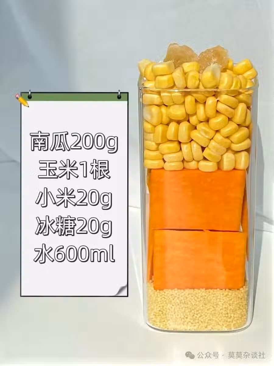 食材:去皮南瓜200g | 甜玉米粒70g(或1根甜玉米) | 小米20g | 冰糖20g | 清水600ml,破壁機米糊模式啟動,最後加入牛奶100~200ml攪拌均勻(可選)