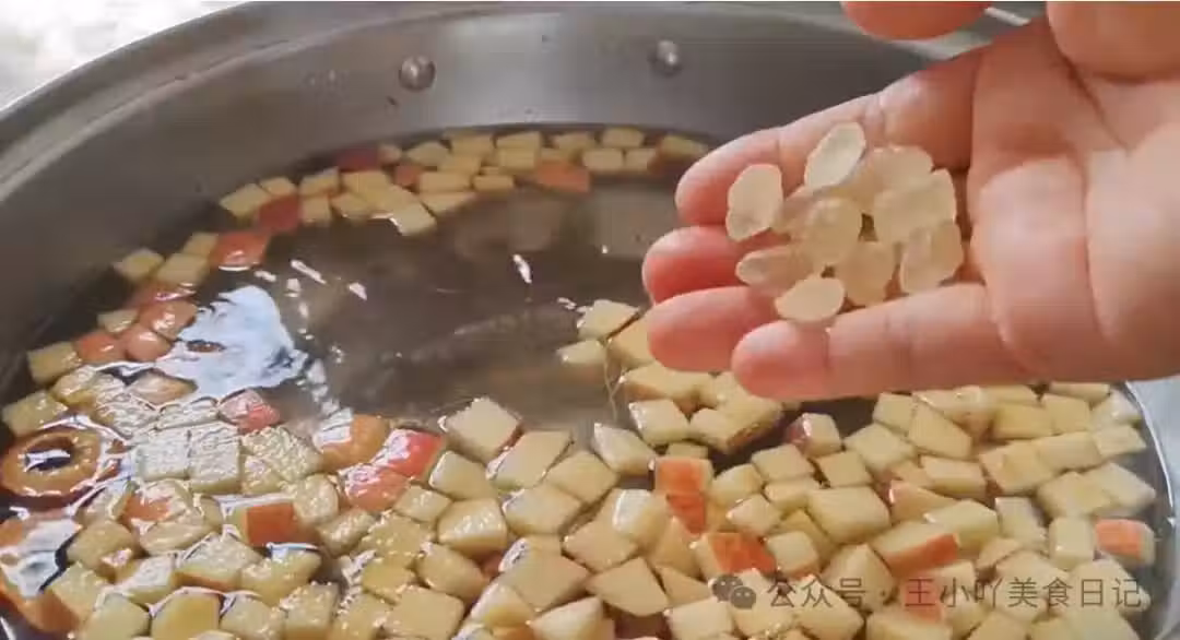 然後,將準備好的蘋果丁和山楂倒入鍋中,加入適量的冰糖(根據個人口味調整),用勺子攪拌均勻。蓋上蓋子,繼續用小火煮10分鐘,讓蘋果和山楂的營養成分充分釋放,煮至蘋果和山楂熟透。