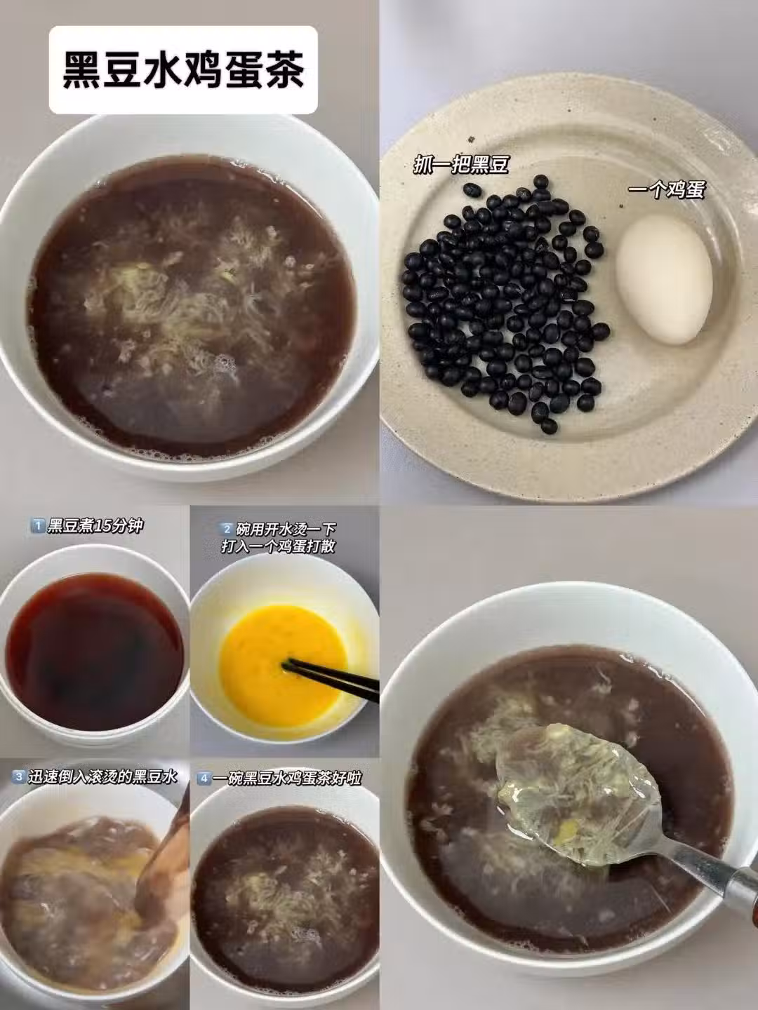 黑豆加水煮15分鐘煮成黑豆水;先用開水燙下碗,打入一個1個雞蛋打散;