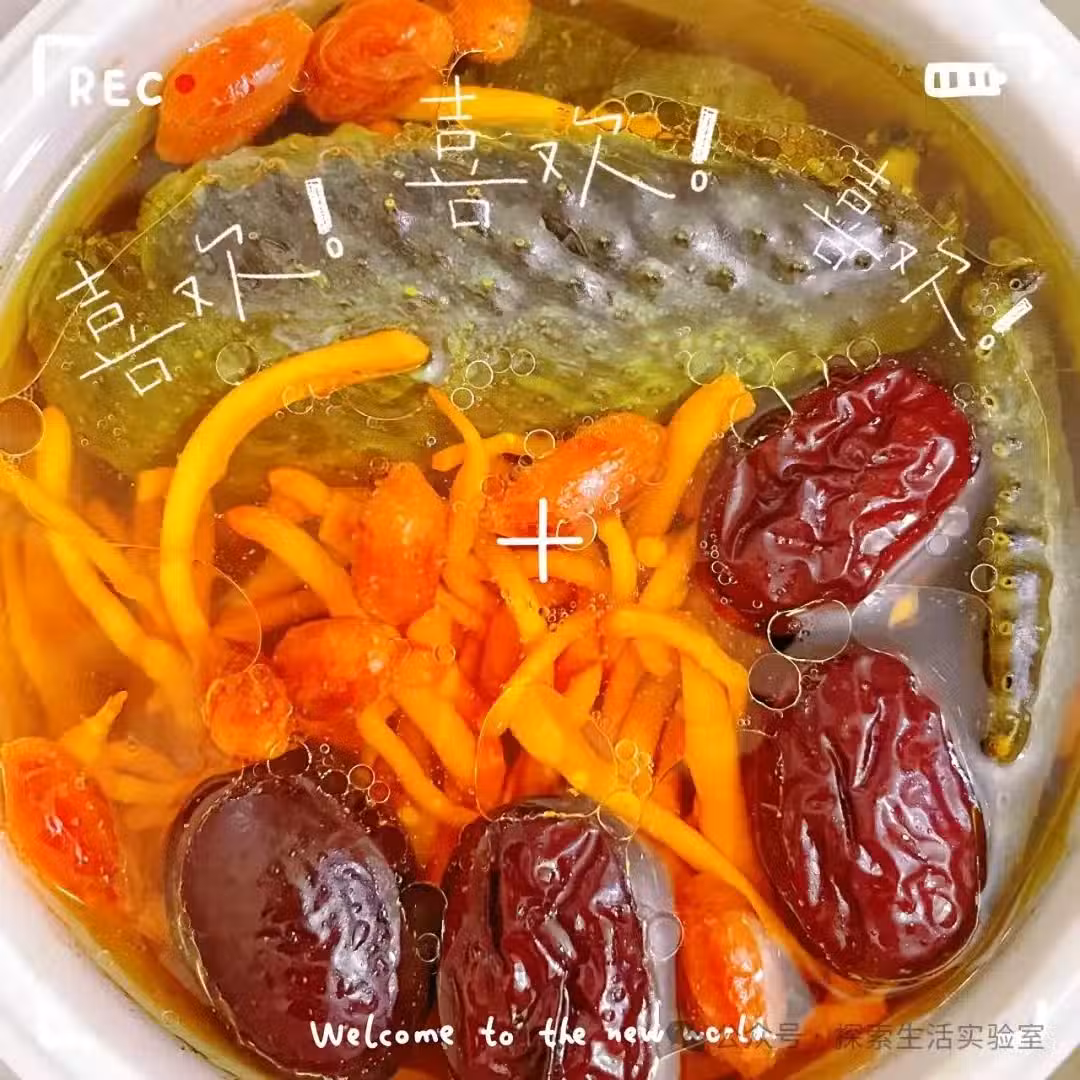 ☑️食材:烏雞半隻、紅棗5顆、枸杞10克、蟲草花適量、薑片