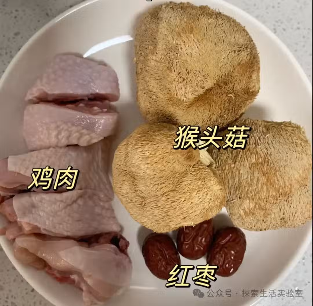 ②紅棗去核,泡發猴頭菇,反覆擠壓換水,反覆清洗浸泡到水變清,再剪去底部硬的地方,撕成小塊