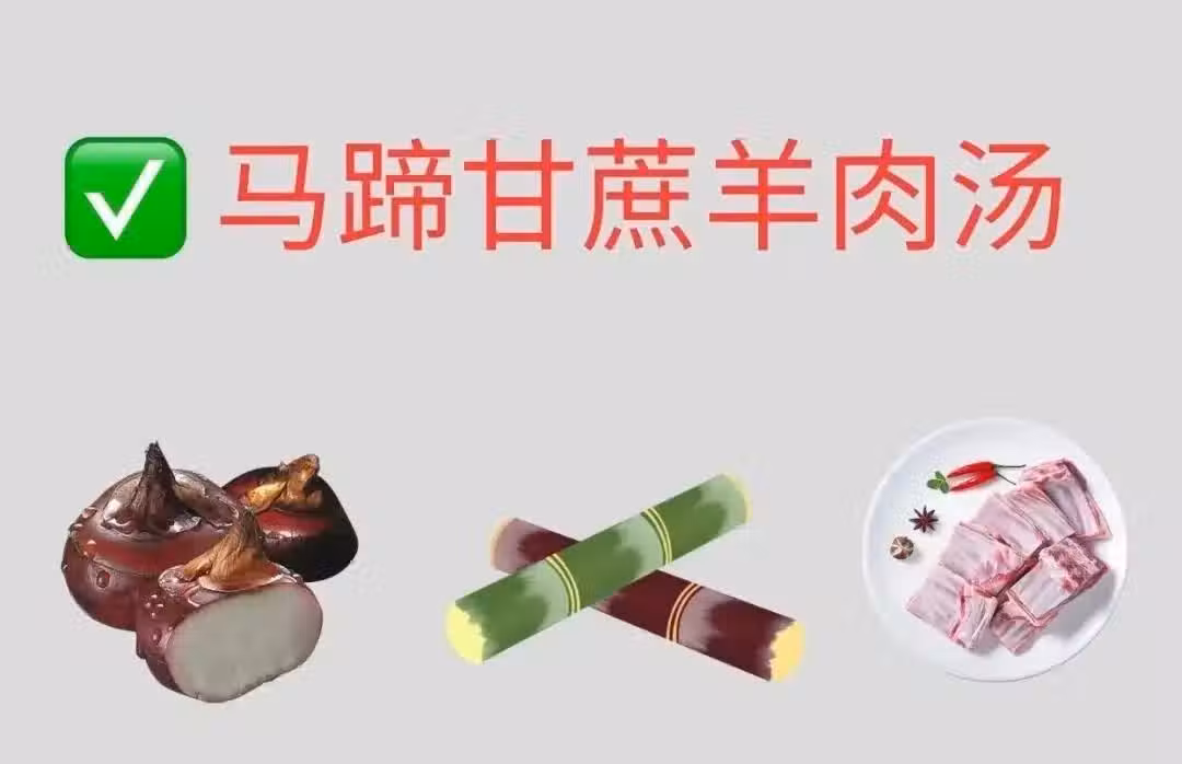 食材:羊肉250克 | 馬蹄6個 | 甘蔗1節 | 當歸10克 | 生薑6片