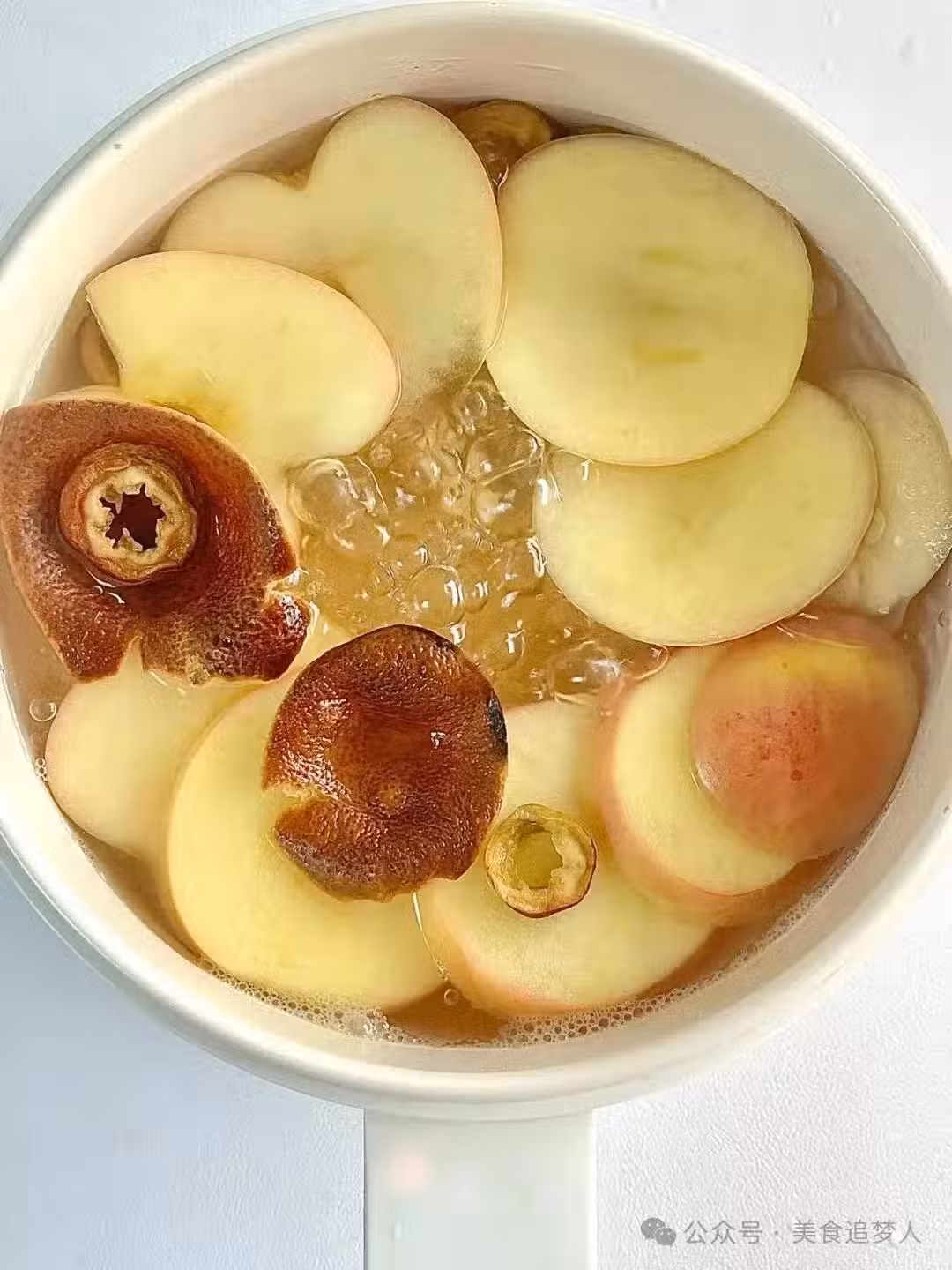 食材:蘋果、陳皮、山楂 做法: 放入少量冰糖養生壺煮40分鐘左右。