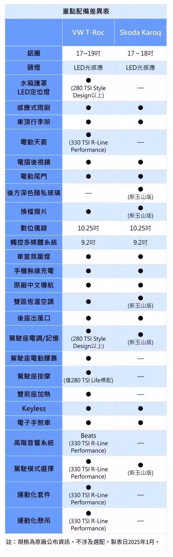 配備表攤開一比,兩車基礎配備都不差,諸如感應式雨刷、電動尾門、10.25吋數位儀表、9.2吋觸控多媒體、手機無線充電、原廠中文導航、車室氣氛燈都有,不過比較細項還是T-Roc略勝一籌,像是雙區恆溫、座椅加熱都列標配,中階以上追加駕駛座電調及記憶功能,還導入水箱罩LED定位燈,視覺上更有特色,如果要率性一點的運動化車型,也有供應R-Line Performance。