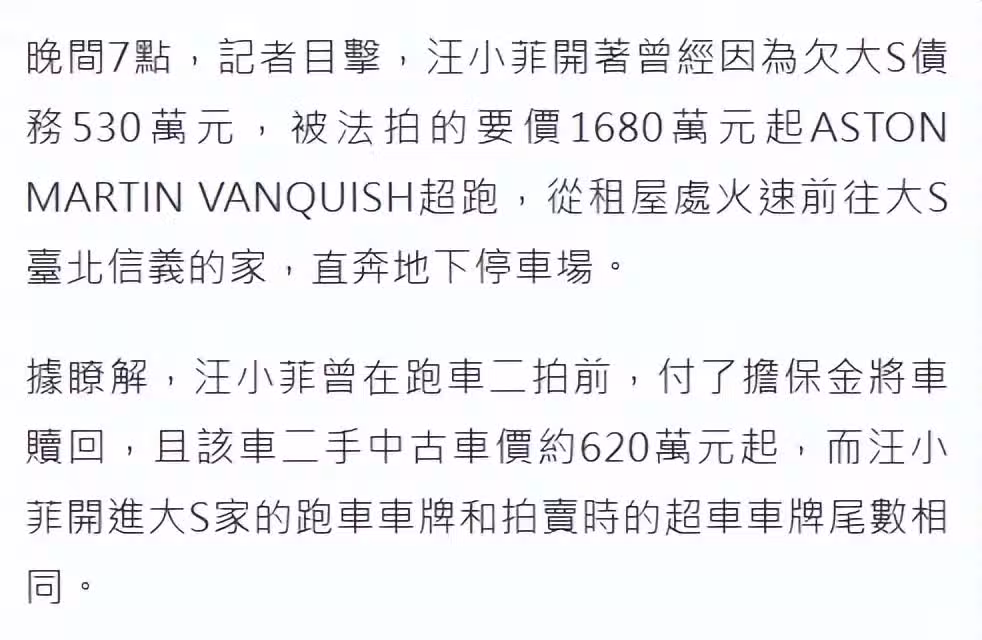 台媒指出,汪小菲開的跑車,三個月前被大S申請在法院門口拍賣,原因是汪小菲拒絕支付500萬台幣的生活費,汪小菲後來繳納保證金才拿回跑車,兩人原本要在2月27日開打官司,如今隨著大S去世,恩怨也將一筆勾銷。