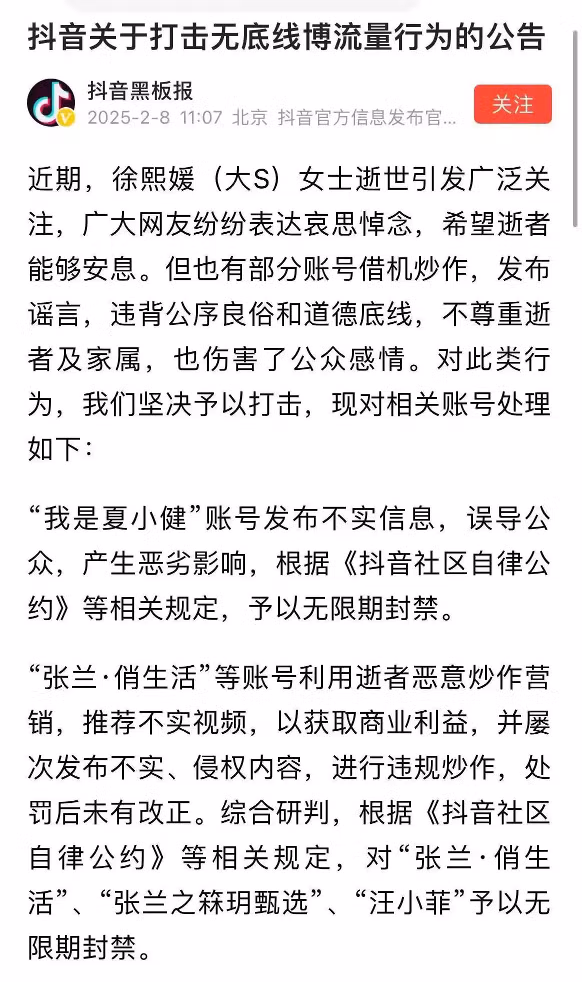 至於剩餘的幾個帳號,即張蘭的兩家公司以及汪小菲的個人號,則因為推薦不實視頻,獲取商業利益,且歷史上屢次違規被處罰都沒有整改,最終決定封禁。