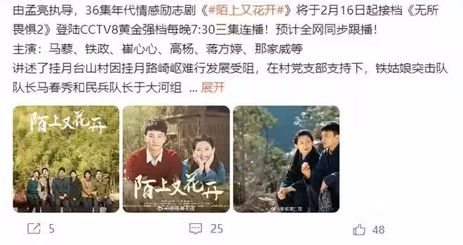 根據可靠消息,由孟亮執導,36集年代情感勵志劇《陌上又花開》將於2月16日起接檔《無所畏懼2》,登陸CCTV8黃金強檔每晚7:30三集連播!